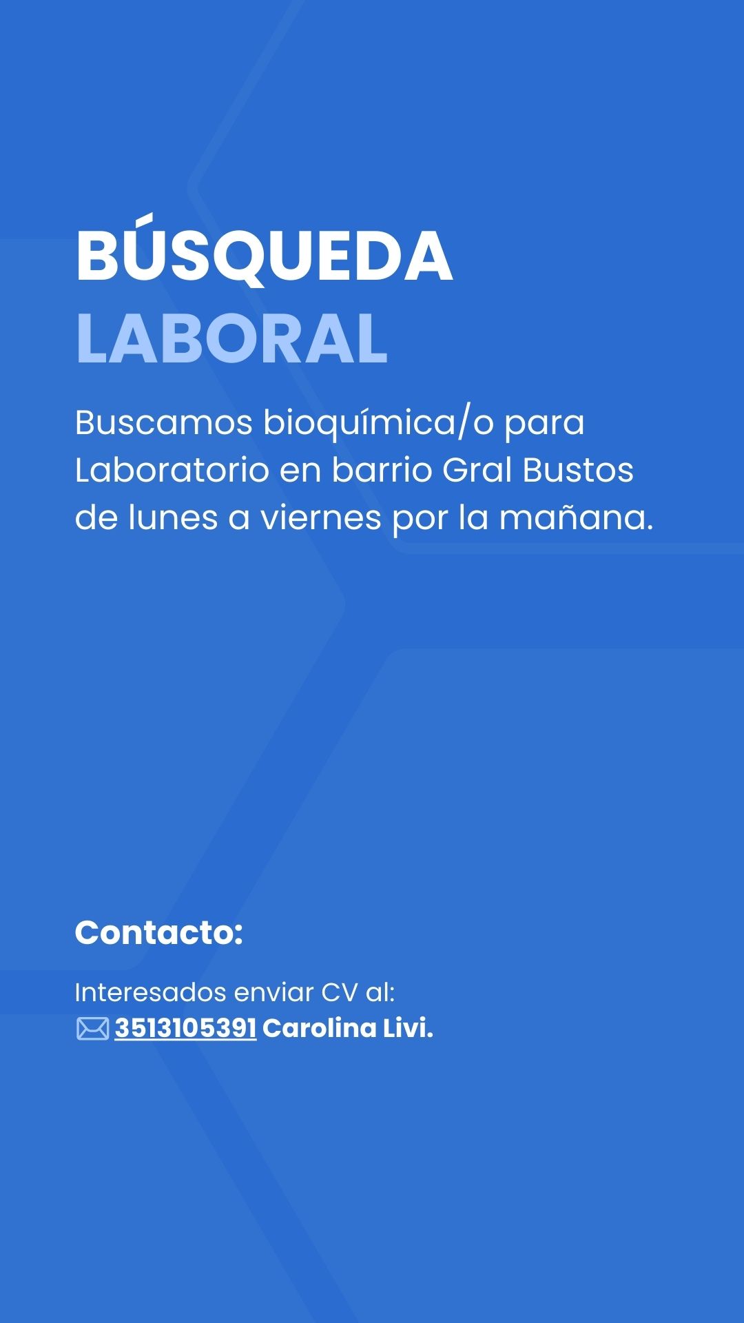 Buscamos bioquímica/o para Laboratorio en barrio Gral Bustos de lunes a viernes por la mañana.