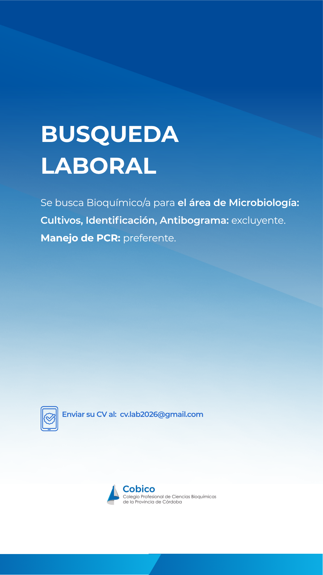 Se busca Bioquímico/a para el área de Microbiología: Cultivos, Identificación, Antibograma: excluyente. Manejo de PCR: preferente.