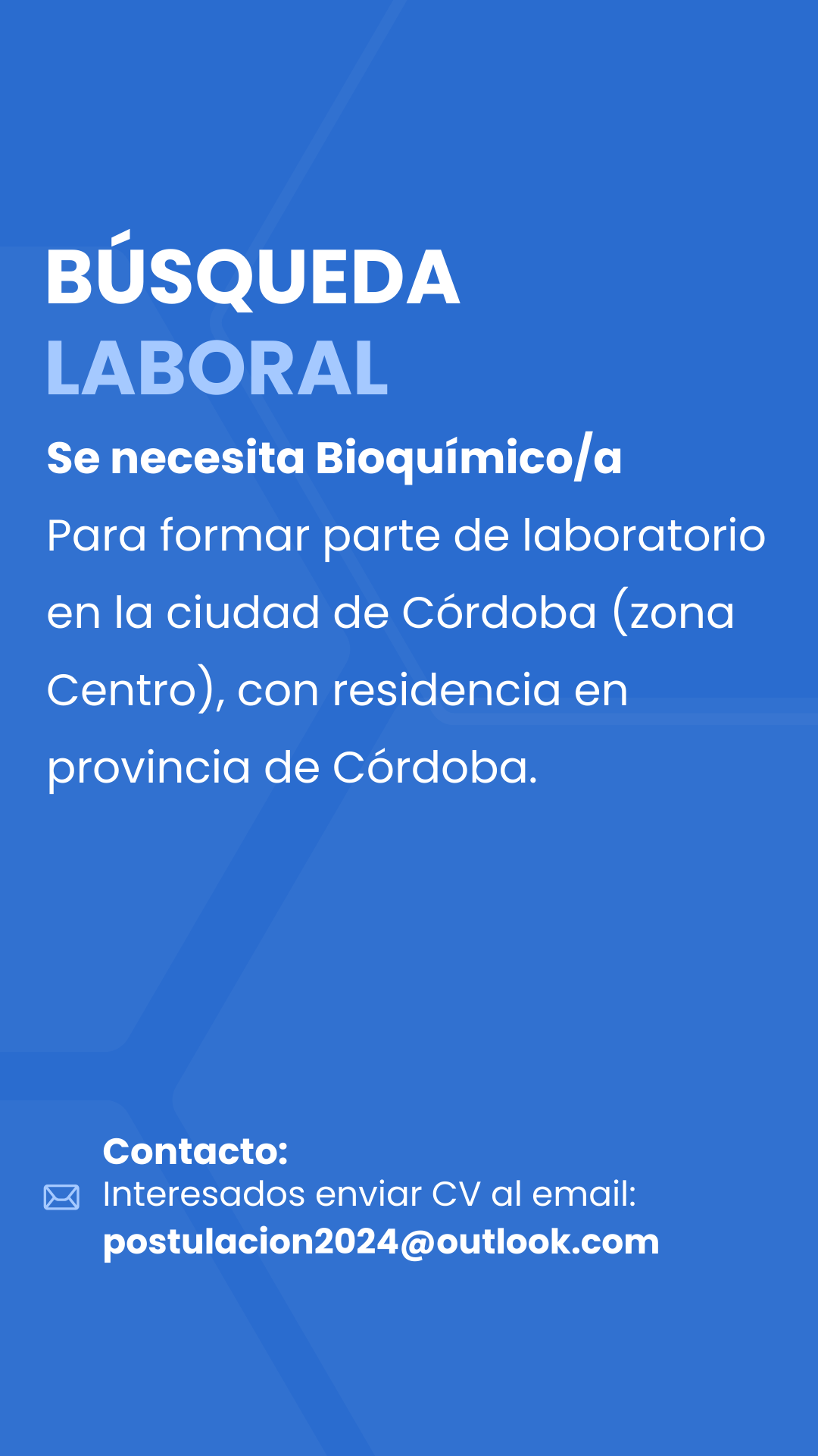 Se necesita Bioquímico/a, para formar parte de laboratorio en la ciudad de Córdoba (zona Centro), con residencia en provincia de Córdoba.